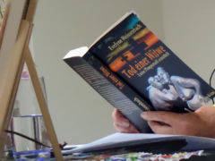 Das Warmup machte die Frau Autorin noch mit Hut. Doch das wurde ihr zuuu hot. Immerhin hatte es auch am Abend noch immer über 30 Grad. Da sie ja immer mit Händen und Füßen liest, stand die Gefahr im Raum, dass sie der Schlag treffen könnte. Drum deshalb besser ohne Hut. Den verwendete sie dann lieber zum Spenden sammeln für die Pannonische Tafel.