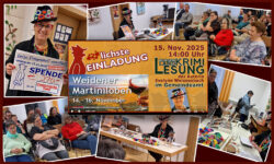 Als „Prophet im eigenen Ort“ durfte die Frau Autorin heuer beim Martiniloben in Weiden am See am 15.11.2025 eine Spendenlesung für die Pannonische Tafel machen. Sie wählte wieder „Tod einer Witwe“, weil es noch gut zum Datum passte. Und auch diese Lesung machte und brachte wieder viel Spaß – und ein erfreuliches Spendenergebnis. Danke!