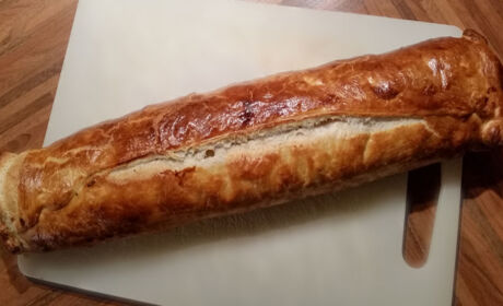 Den Blätterteig aufrollen, eine dünne Schichte Kräuterkäse aufstreichen, dann die Erdäpfelmasse und noch eine Schichte Kräuterkäse. Strudel einrollen und mit dem restlichen Ei bestreichen.